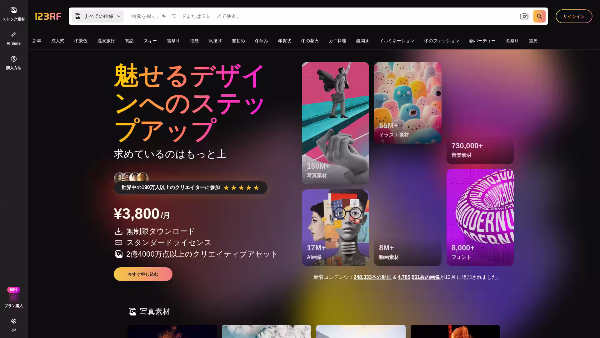 123RF is a stock content provider that offers a wide range of royalty-free stock images, photos, vectors, illustrations, footage, video, and music for nearly any application. They also provide AI-powered tools for image generation and editing.