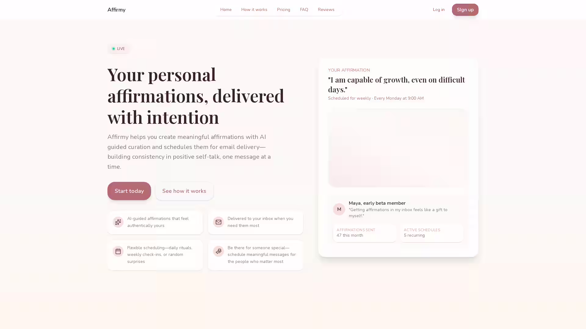 Are there free plans? Yes, Affirmy offers a free tier with 2 welcome messages to experience the platform. Paid plans start at $6/month for additional affirmations and features.