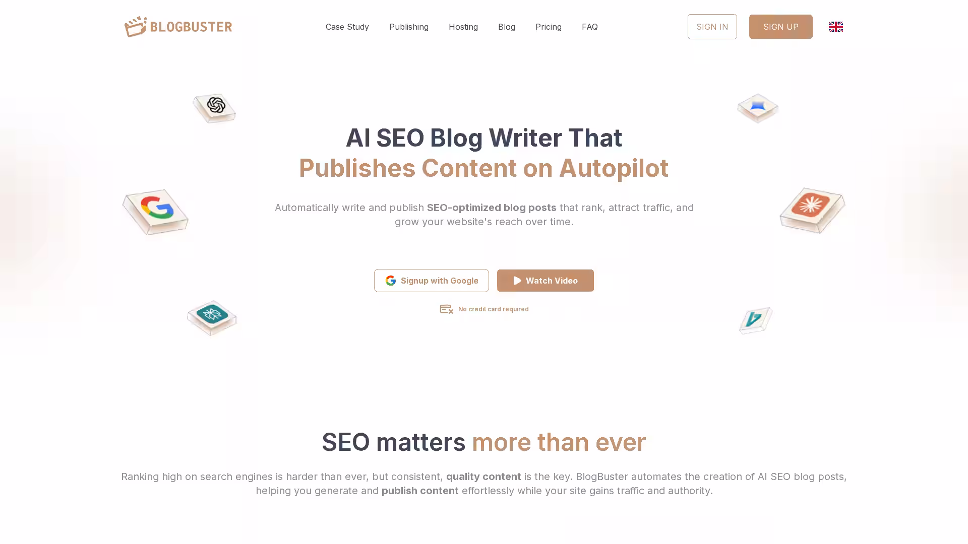 BlogBuster is an advanced AI-powered SEO blog post and article writer designed to help businesses, bloggers, and marketers effortlessly create, optimize, and publish high-quality SEO content on autopilot. In today’s competitive digital landscape, ranking high on search engines like Google and Bing is critical but challenging. BlogBuster automates the entire SEO blogging workflow—from generating trending topics and AI-written articles to auto-linking relevant pages and publishing content—so your website can attract more traffic, build domain authority, and grow sustainably without manual effort.