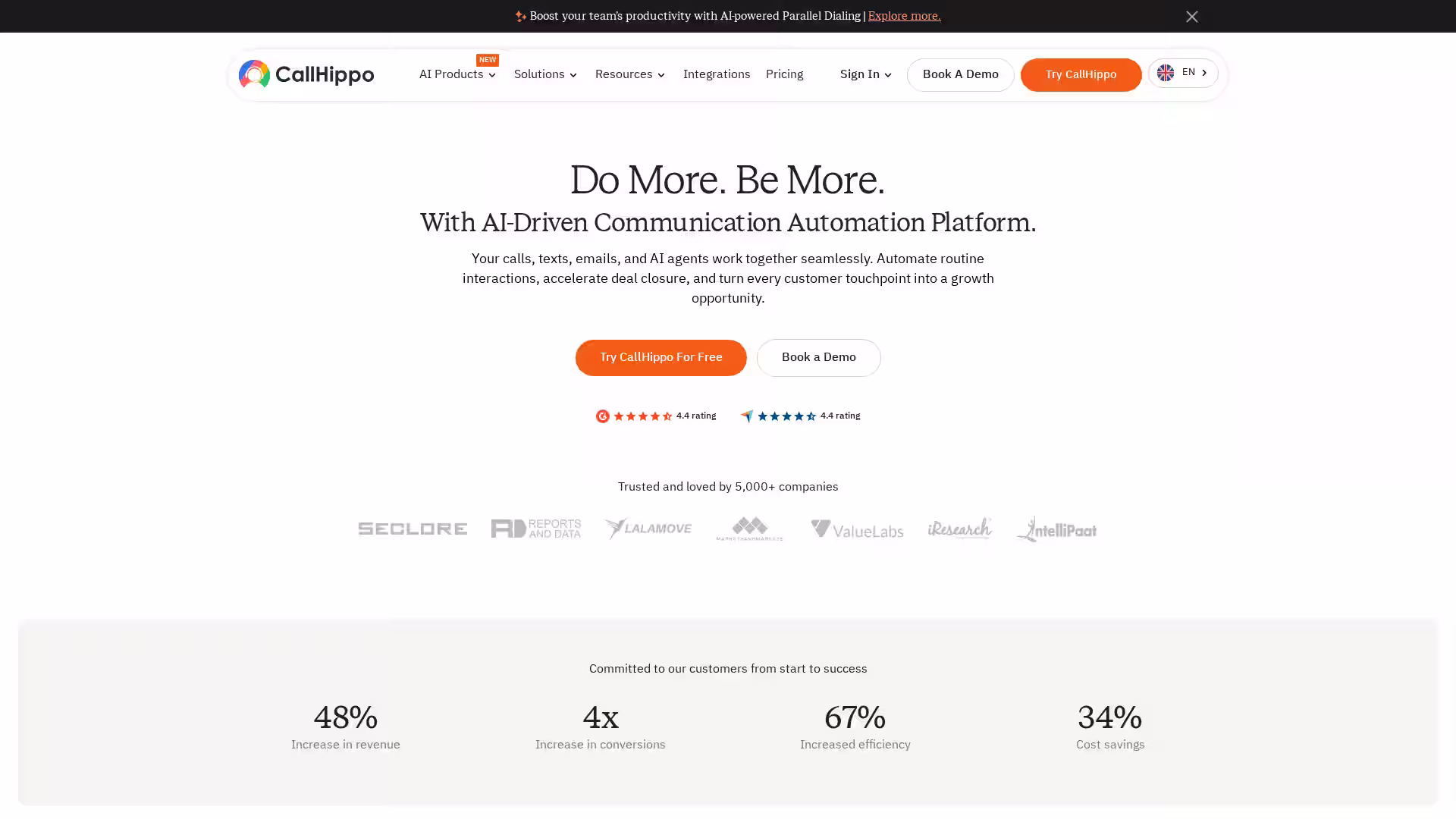 CallHippo is an AI-driven communication automation platform designed to streamline and enhance business communication. It offers a reliable cloud-based virtual phone system integrated with advanced AI capabilities such as parallel dialing, AI voice agents, and omnichannel messaging. Trusted by over 5,000 companies worldwide, CallHippo empowers sales, support, and call center teams by automating routine interactions, accelerating deal closures, and unifying customer conversations. Whether you need a robust business phone system, intelligent call routing, or AI-powered agents, CallHippo provides an all-in-one solution to boost team productivity and customer engagement.