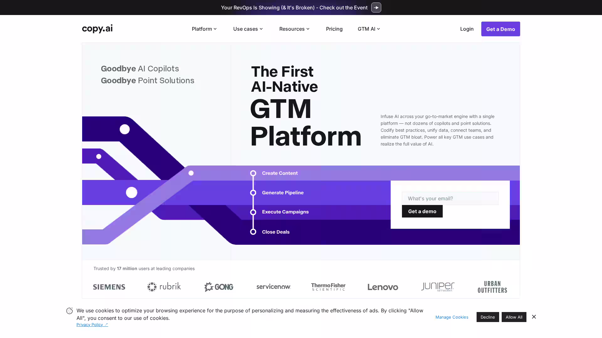Copy.ai is the world’s first purpose-built, AI-native go-to-market (GTM) platform designed to eliminate GTM bloat by unifying multiple AI use cases into a single, seamless system. Moving beyond traditional AI copilots and narrow point solutions, Copy.ai empowers businesses to future-proof revenue operations by centralizing workflows, automating targeted tasks, and harmonizing data across teams. Trusted by over 17 million users at leading companies such as Juniper Networks and Lenovo, Copy.ai delivers a robust platform that enables marketing, sales, and operations teams to collaborate efficiently and accelerate revenue growth.