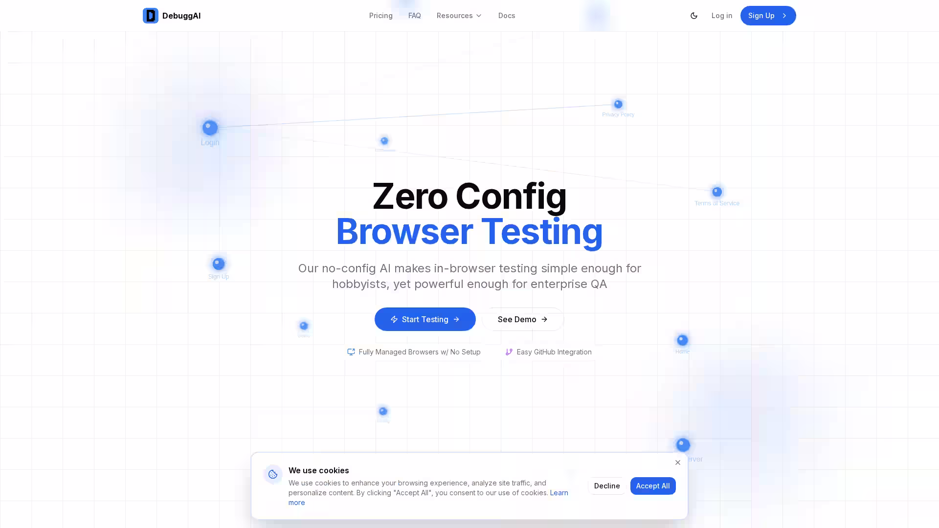 Do I need to configure anything? No. Setup involves installing the GitHub App and adding a workflow file—Debugg AI handles the rest.