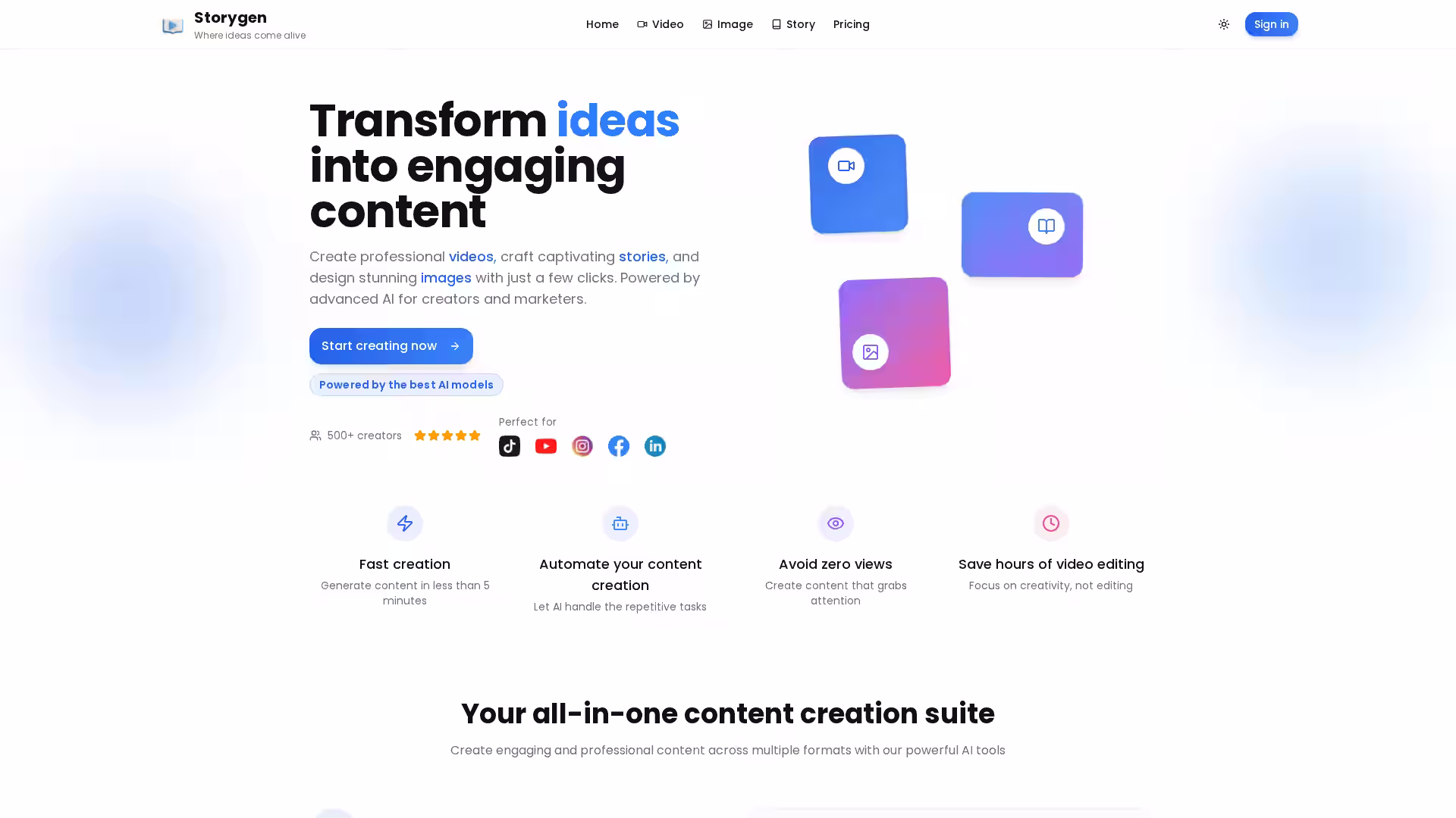 All-in-one AI platform to generate videos, stories, and images instantly, empowering creators to produce captivating content in minutes.