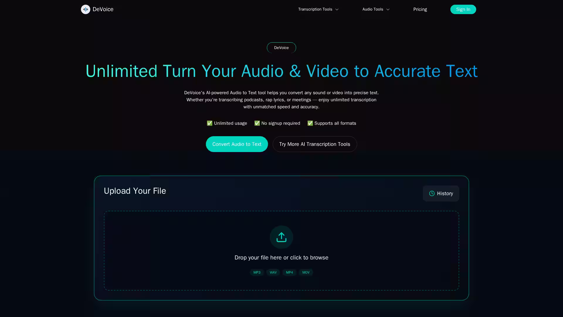 DeVoice is an advanced AI-powered platform designed to convert audio and video files into precise, structured text quickly and accurately. Supporting all popular file formats, DeVoice allows users to transcribe podcasts, interviews, meetings, YouTube videos, and more, with unlimited usage and no signup required. Beyond transcription, it offers a robust suite of AI audio tools including background noise removal, AI voice enhancing, voice changing, rap lyric generation, and more, making it ideal for content creators, professionals, musicians, and podcasters who demand high-quality audio processing and transcription.