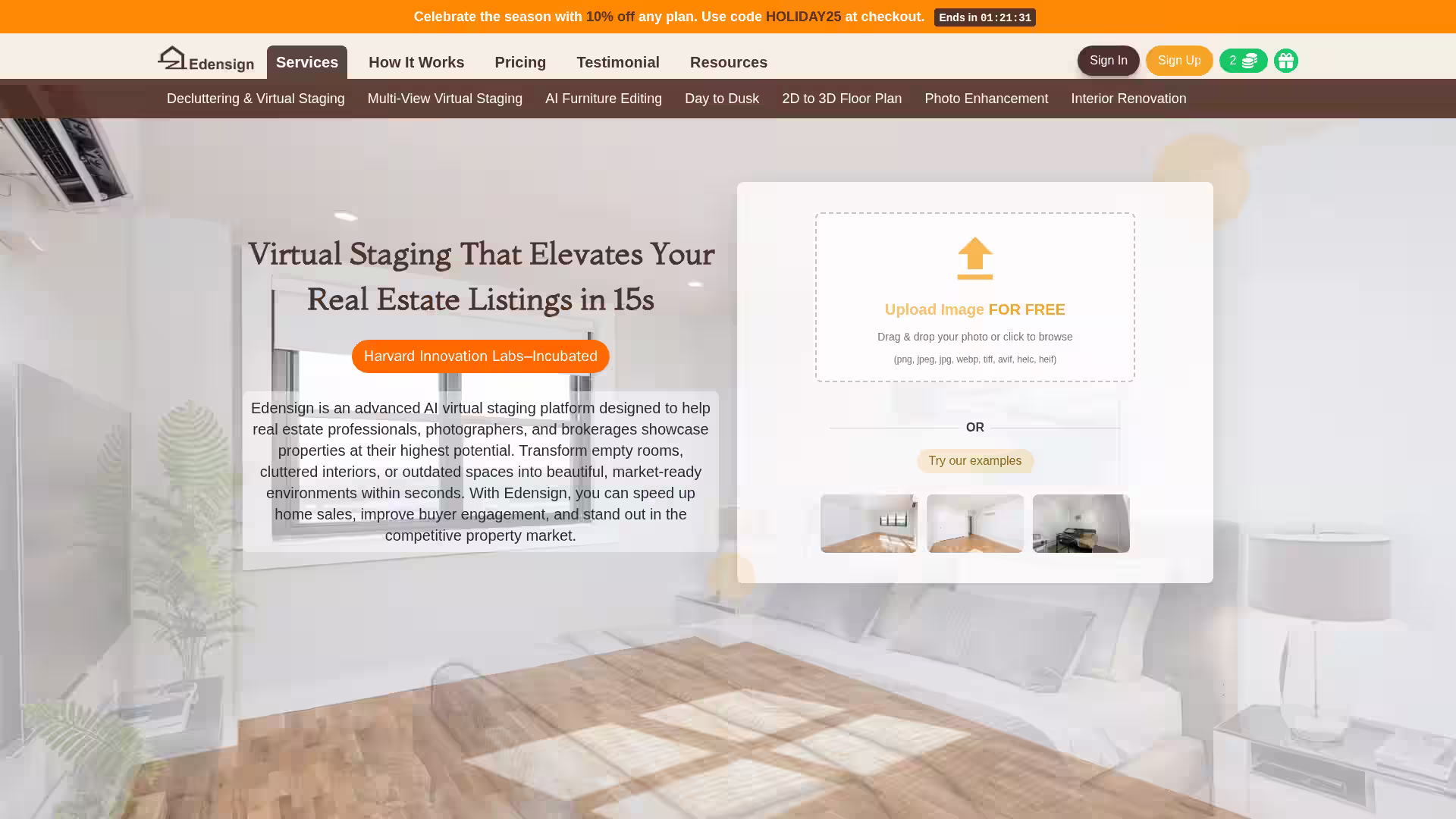 Edensign is a cutting-edge AI-powered virtual staging platform designed to elevate real estate listings with stunning, market-ready images in just seconds. Whether you're a real estate professional, photographer, or brokerage, Edensign helps you transform empty, cluttered, or outdated interiors into beautifully staged spaces optimized for MLS listings, property websites, and social media. Powered by advanced AI technology and incubated by Harvard Innovation Labs, Edensign offers unique features like multi-view virtual staging, furniture replacement, day-to-dusk transformations, 2D to 3D floor plans, photo enhancement, and AI-generated MLS-ready listing descriptions. Trusted by major brokerages and scalable from solo agents to enterprise teams, Edensign offers instant turnaround times without the need for costly physical staging or Photoshop skills.