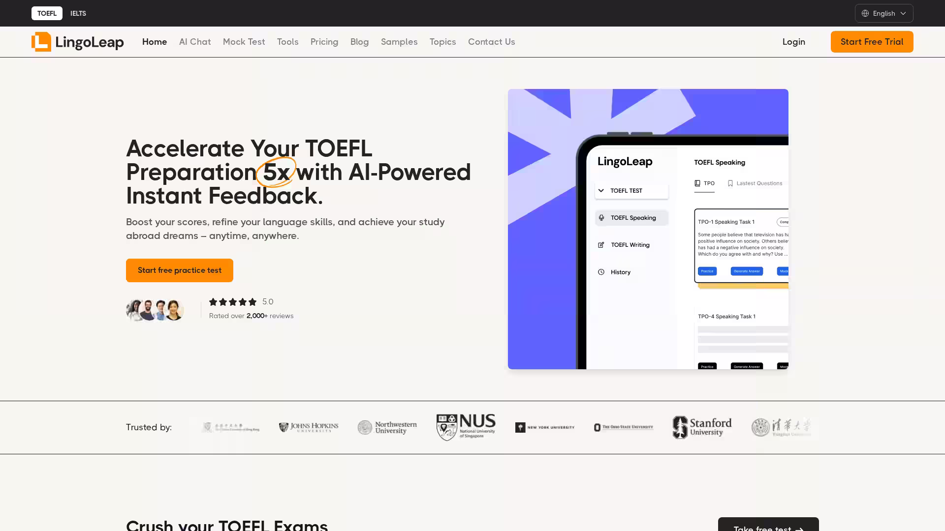 By combining advanced natural language processing algorithms with extensive TOEFL expertise, LingoLeap helps learners identify weaknesses, expand vocabulary, develop coherent ideas, and master the exam format anytime, anywhere. Trusted and highly rated by over 2,000 users, it’s the essential tool to sharpen your language skills and confidently approach your TOEFL test.