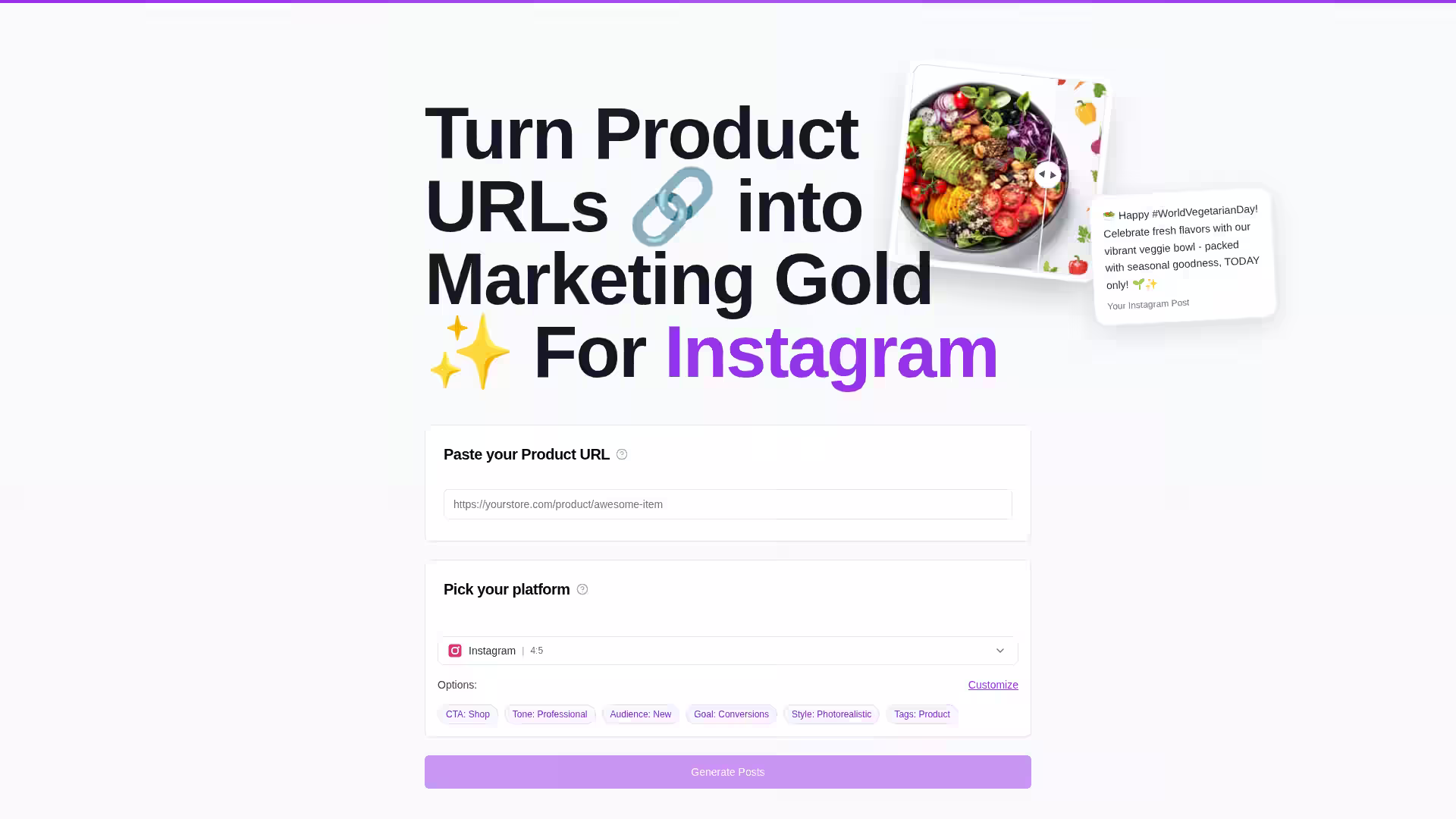 Select or customize calls-to-action to drive clicks and sales, while receiving AI-suggested hashtags tailored to your product niche.
