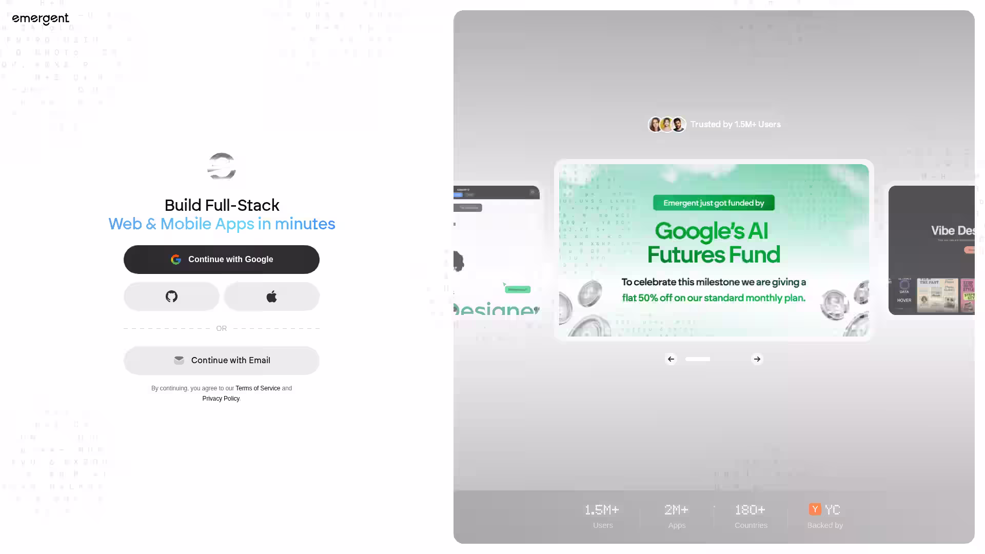 Q: How can I start using Emergent? A: You can get started instantly by signing in with your Google account or email address on the Emergent website.
