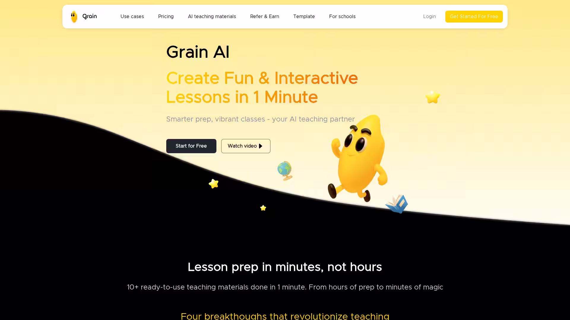 Grain AI is a next-generation teaching companion designed to help educators create engaging, interactive, and professional-quality lessons in just 60 seconds. Whether you're preparing for a science class on photosynthesis, a math lecture on quadratic functions, or a history lesson, Grain AI automates lesson preparation by generating complete teaching packs with over 10 different material types — including comics, maps, interactive apps, audio guides, exercises, and flashcards. This means that what used to take hours of research and assembly now takes just one minute.