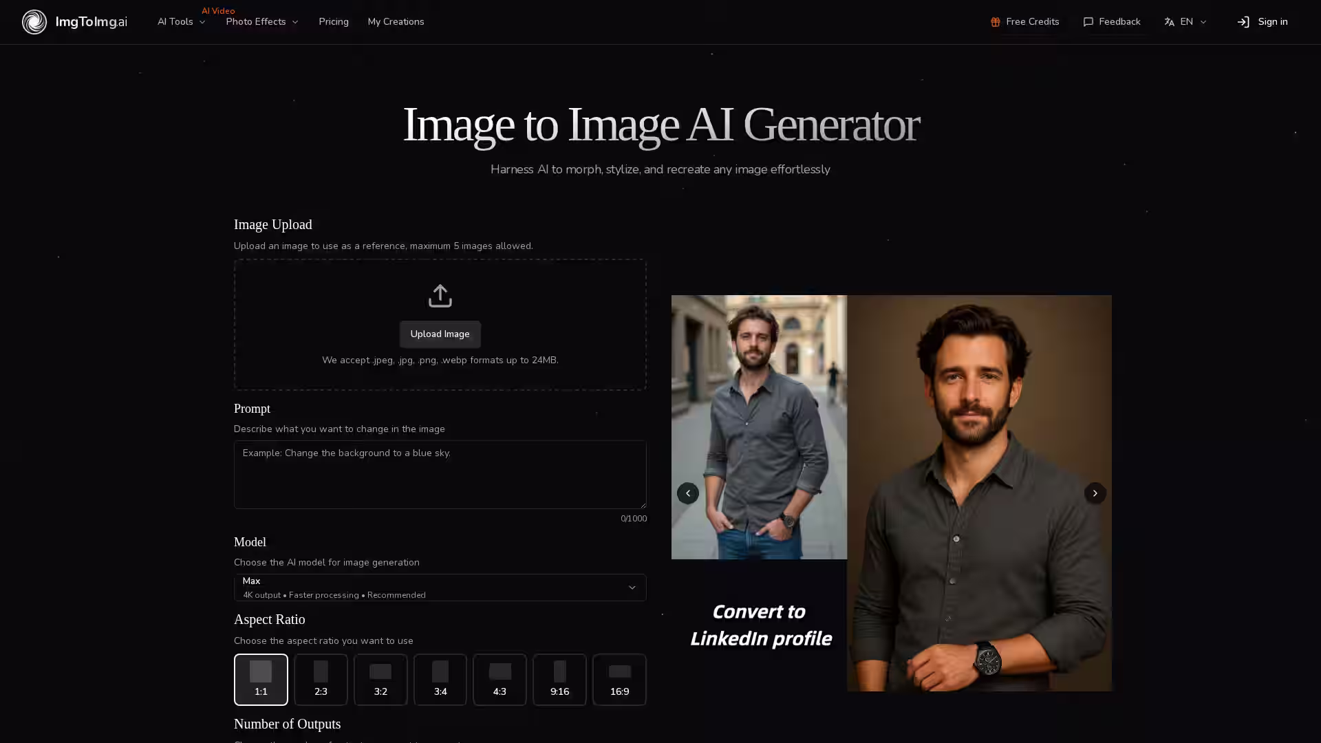 Image To Image AI is a powerful, free online image transformation platform that leverages advanced artificial intelligence to morph, stylize, and recreate images while maintaining their original composition. Unlike text-to-image generators that create images from scratch, this tool uses your existing images as a base, applying your chosen modifications to generate new variations quickly and professionally. It supports up to five image uploads per session in popular formats such as JPEG, PNG, and WEBP, with files up to 24MB and resolutions up to 4096 x 4096 pixels.