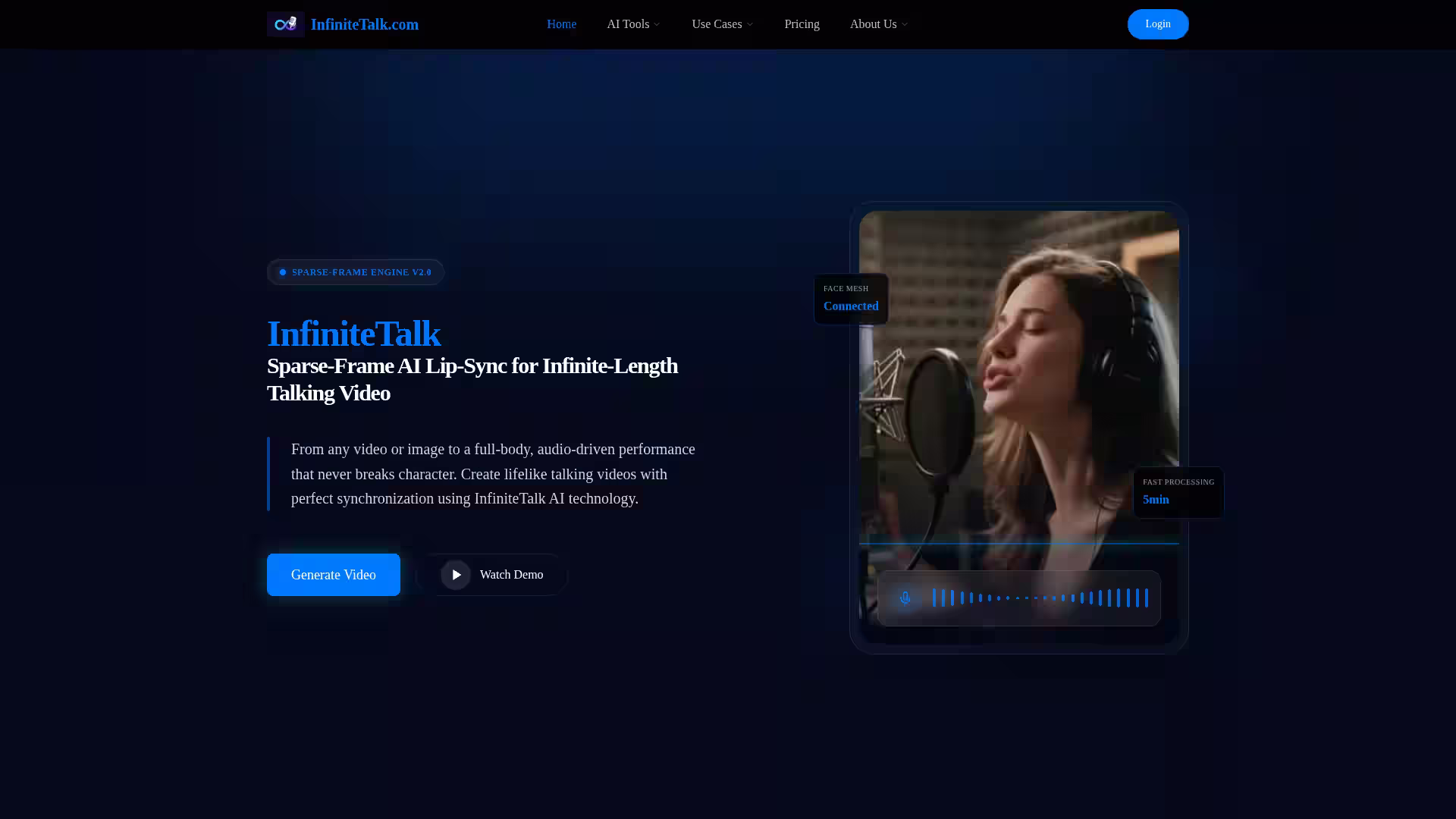 InfiniteTalk is an advanced AI-powered lip-sync talking video generator that enables users to create infinite-length videos featuring lifelike avatars. Leveraging proprietary Sparse-Frame Engine V2.0 technology, InfiniteTalk transforms any photo or video into a full-body, audio-driven performance with realistic head movements, body posture, and micro-expressions. This platform supports unlimited video duration and produces high-fidelity lip-syncing and holistic avatar animation, making it ideal for content creators, educators, marketers, and enterprises seeking a scalable, efficient solution to generate engaging talking videos.