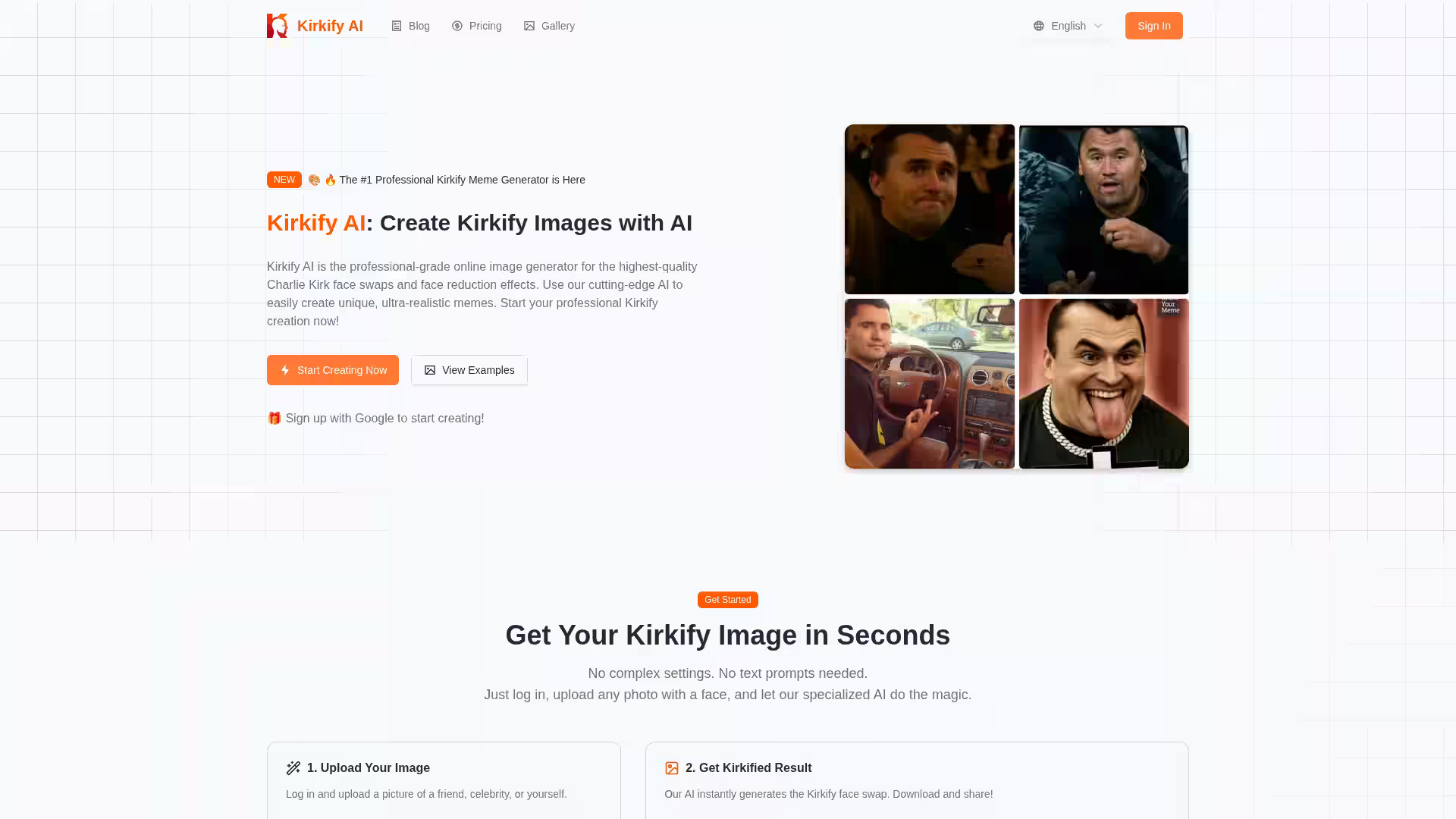 One-Click Generation: Simply log in, upload your photo, and generate your Kirkify meme instantly — no text prompts or adjustments required.