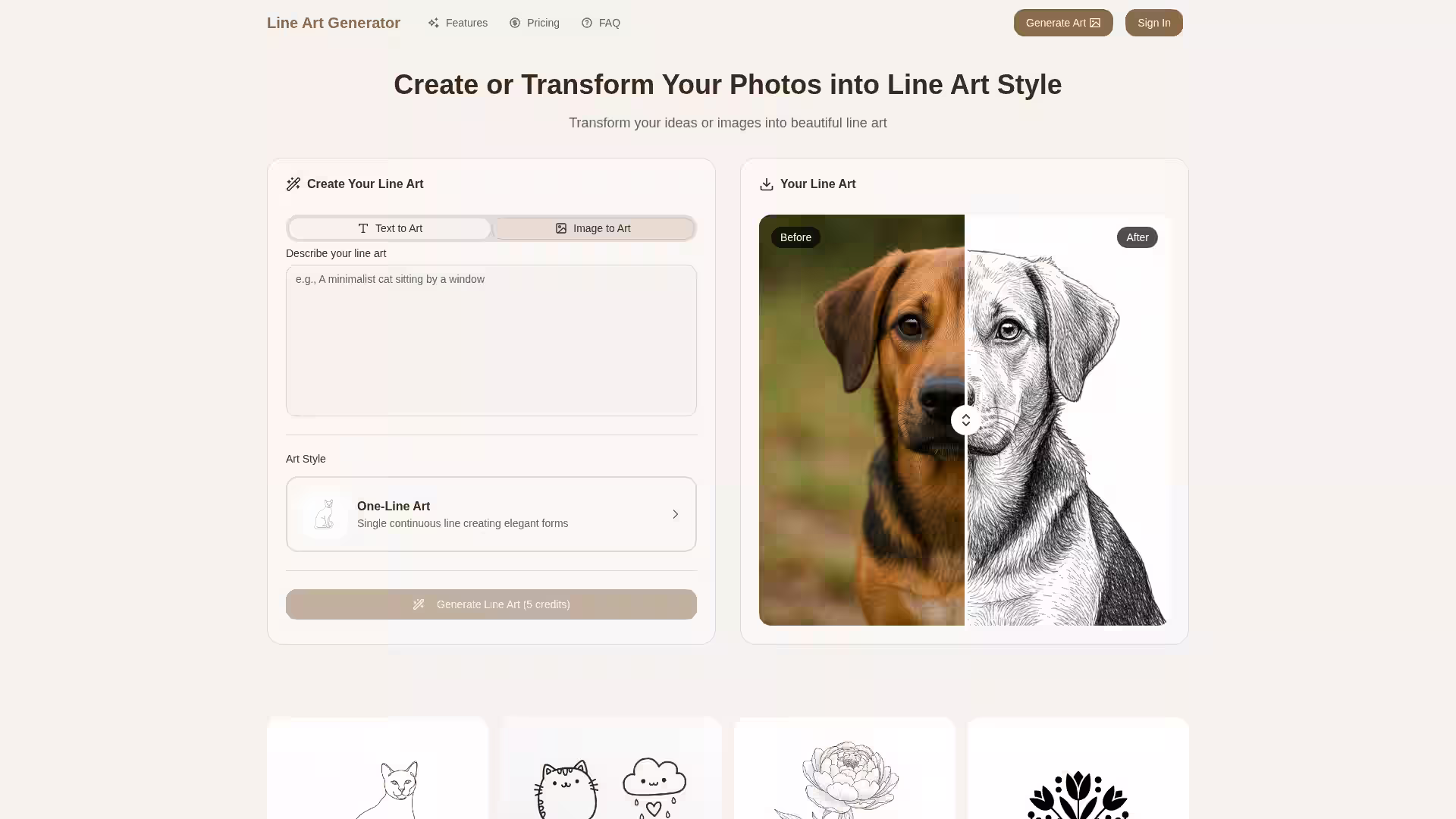Start turning your photos and ideas into captivating line art with Line Art Generator, the fast, high-quality, and versatile AI-powered sketch creator.
