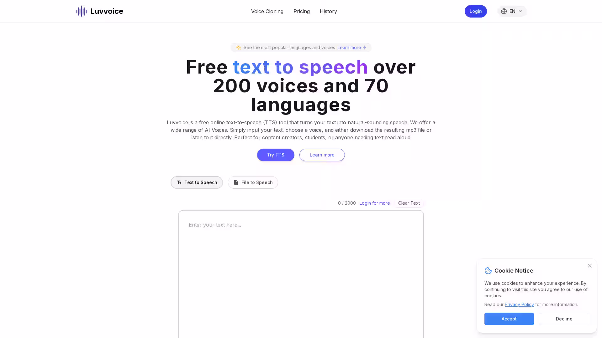 Luvvoice is a free online Text-to-Speech (TTS) platform that enables users to instantly convert written text into natural-sounding audio without restrictions. Designed for simplicity and accessibility, Luvvoice removes common limitations found in other TTS services—most notably, word count caps—allowing users to process any amount of text at once. Whether you need to generate a single sentence or an entire document, Luvvoice delivers seamless audio conversion without requiring downloads or complex setup.