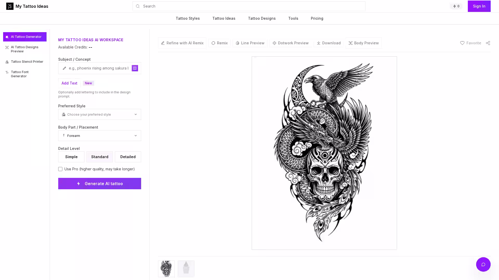 AI Tattoo Generator — Generate fresh tattoo design concepts in seconds with a style, subject, and placement of your choice.