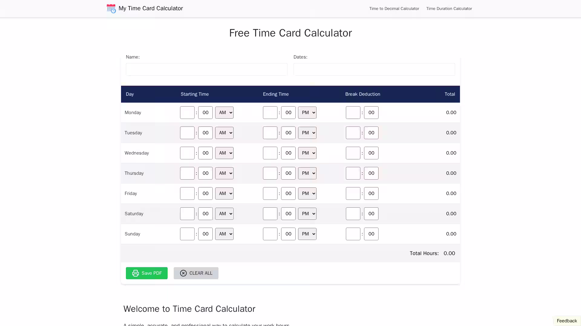 My Time Card Calculator is an intuitive online tool designed to simplify the process of calculating work hours, overtime, break times, and pay. Whether you're an employee tracking your hours for payroll or an employer ensuring accurate time keeping for your team, this calculator offers easy and accurate time tracking without complex spreadsheets or manual calculations.