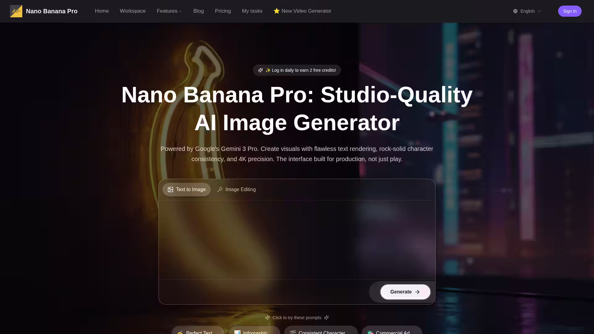 Next-gen 4K AI image generator with flawless text rendering, character consistency, and deep reasoning powered by Gemini 3 Pro.
