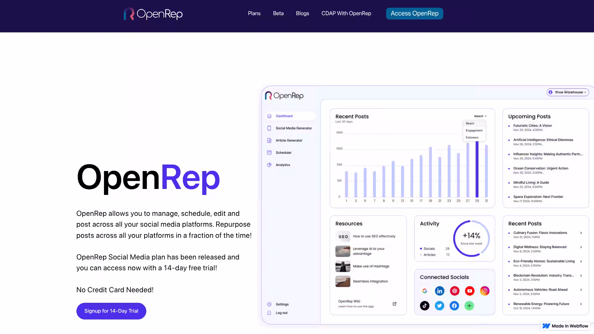 OpenRep is a comprehensive AI-powered digital marketing platform designed to streamline your social media management, content creation, and SEO optimization processes. Ideal for marketers, businesses, and content creators, OpenRep centralizes social media scheduling, post editing, bulk actions, and performance analytics across multiple platforms. It also offers advanced AI tools including a social media caption generator, SEO content creator, and an AI-driven image design suite. With customizable tones, keywords, and context-aware AI models, OpenRep helps users produce high-quality, platform-optimized content effortlessly. Available with flexible monthly and annual plans, OpenRep includes a 14-day free trial with no credit card required, enabling new users to explore its capabilities risk-free.