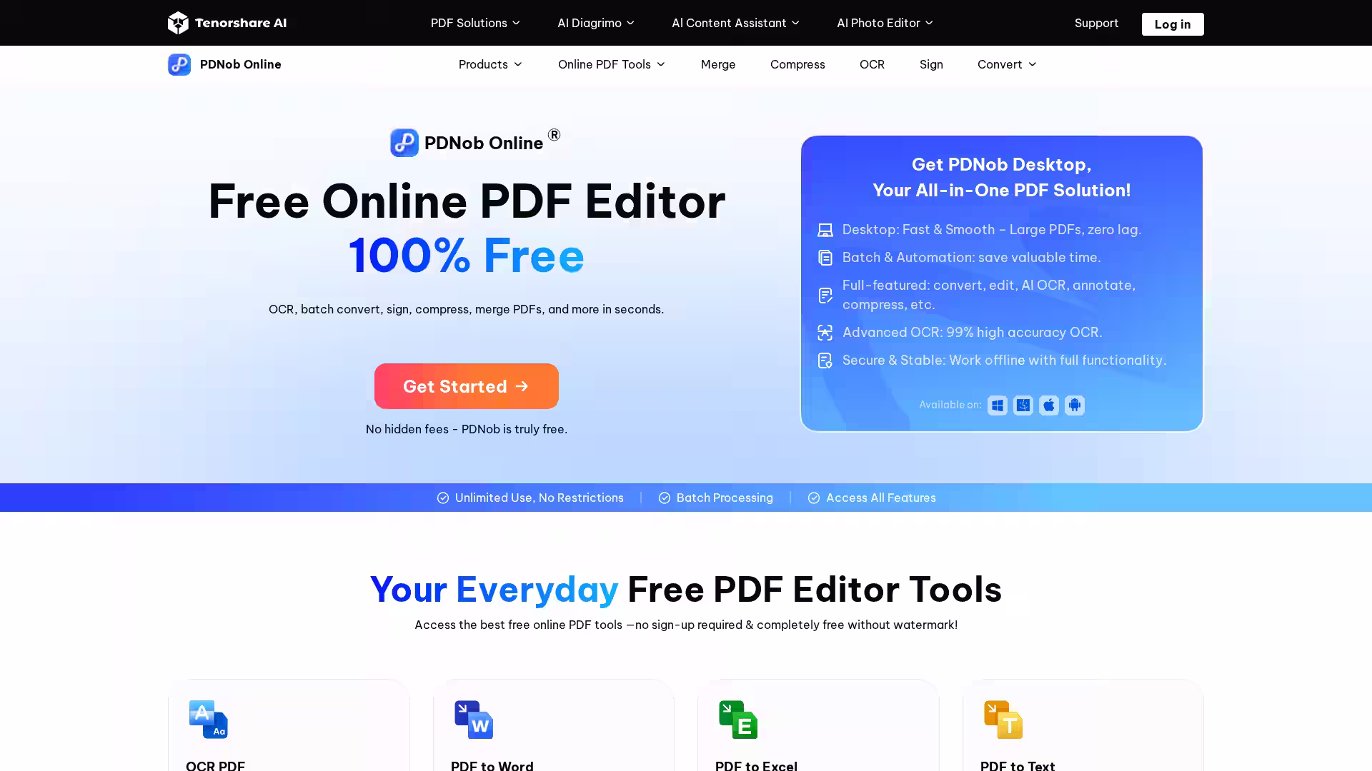 PDNob Online PDF Editor is a 100% free, browser-based PDF solution developed by Tenorshare. Designed for ultimate accessibility, it enables users to edit, convert, compress, merge, split, and sign PDFs directly online without registration, watermarks, or hidden fees. Powered with advanced OCR (Optical Character Recognition) powered by Abbyy and AI-assisted PDF tools, PDNob Online stands out as a professional-grade tool accessible to anyone.