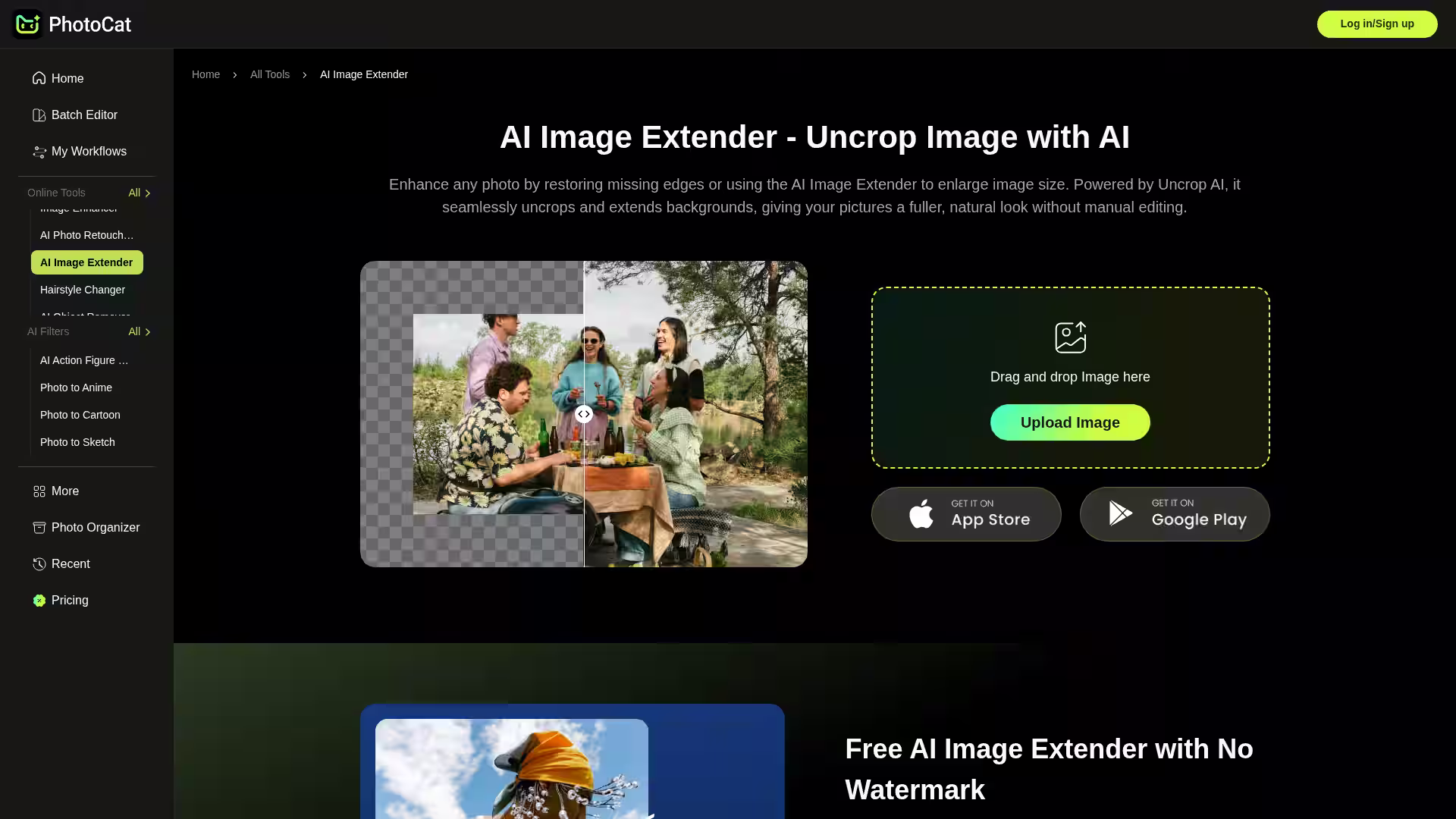 PhotoCat AI Image Extender is a powerful online tool that uses advanced AI technology to seamlessly expand and uncrop your photos. Whether you're looking to enlarge product shots, extend backgrounds, or add more visual space to portraits and landscapes, PhotoCat intelligently analyzes your images and generates realistic, high-resolution 4K extensions. Unlike typical cropping or stretching methods, this AI-powered tool creates natural-looking, distortion-free expansions without any watermarks. Accessible for free and easy to use, PhotoCat AI Image Extender helps photographers, marketers, and social media users get perfectly sized images tailored for various platforms, all without manual editing.