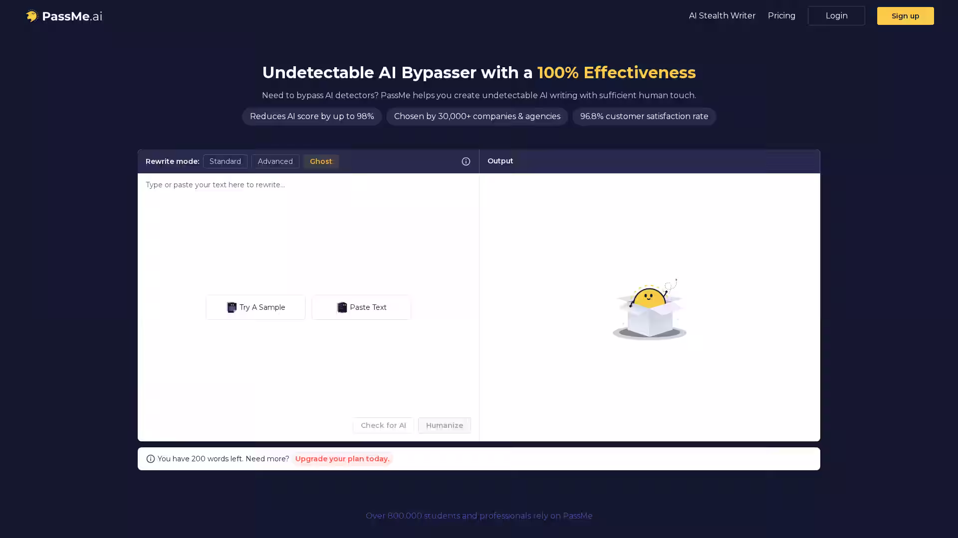 A: Over 800,000 students, academics, professionals, and businesses worldwide rely on PassMe AI for creating undetectable AI writing.