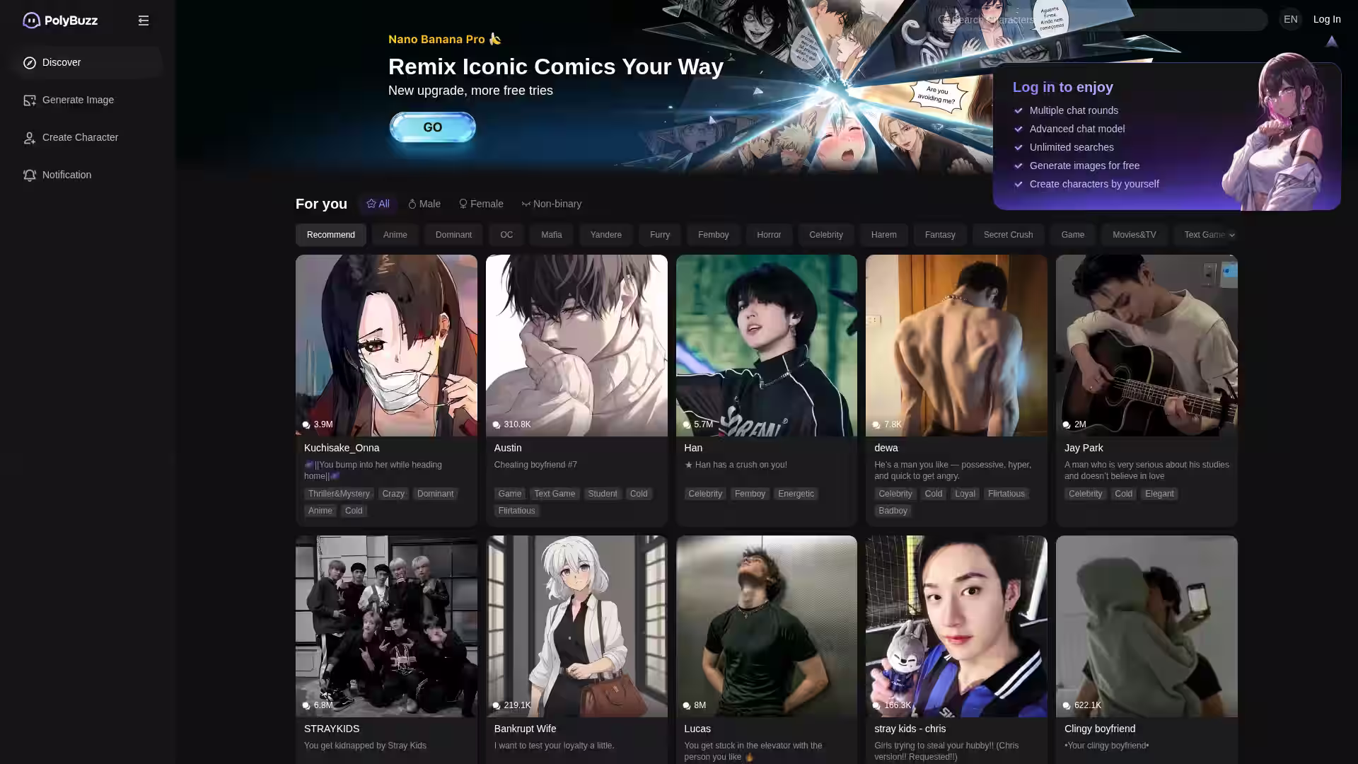A: PolyBuzz hosts thousands of characters including anime, manga, celebrities, original characters (OCs), and various fictions such as vampires, mafia, gamers, and more.