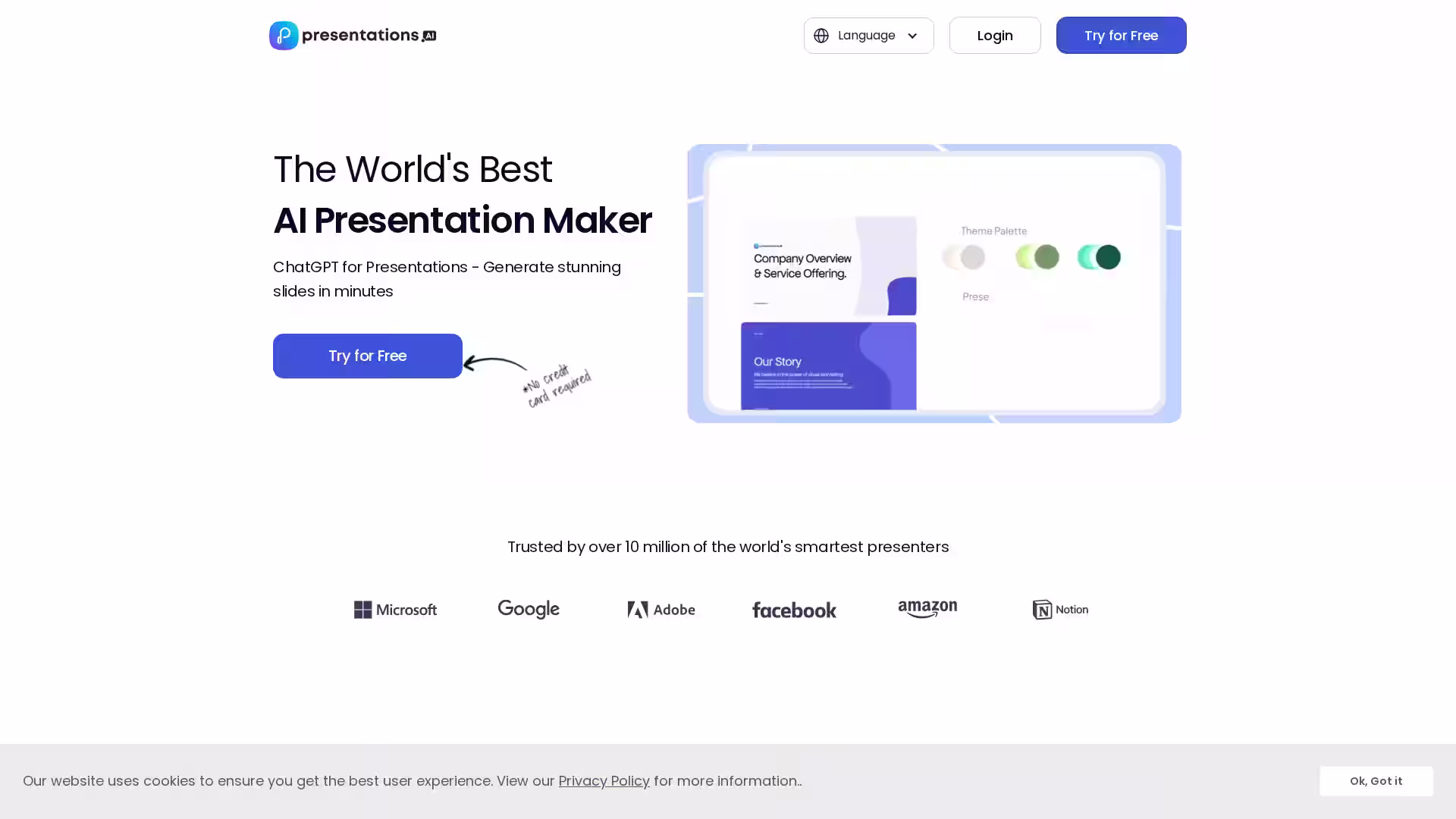 A: Yes, you can try Presentations.AI for free with no credit card required.