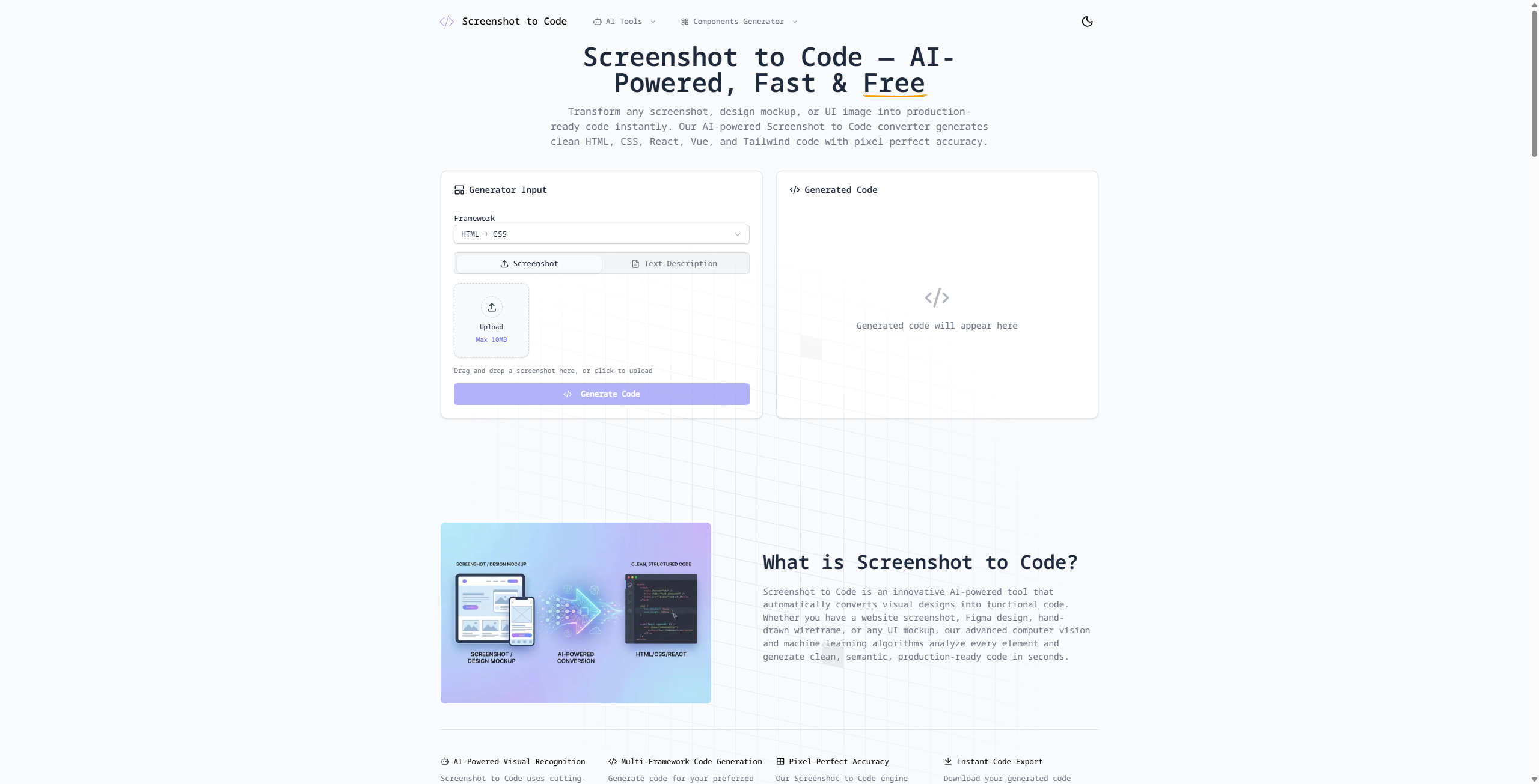 Screenshot to Code converts screenshots to HTML/CSS code instantly. Free AI-powered tool for developers. Try Screenshot to Code now!