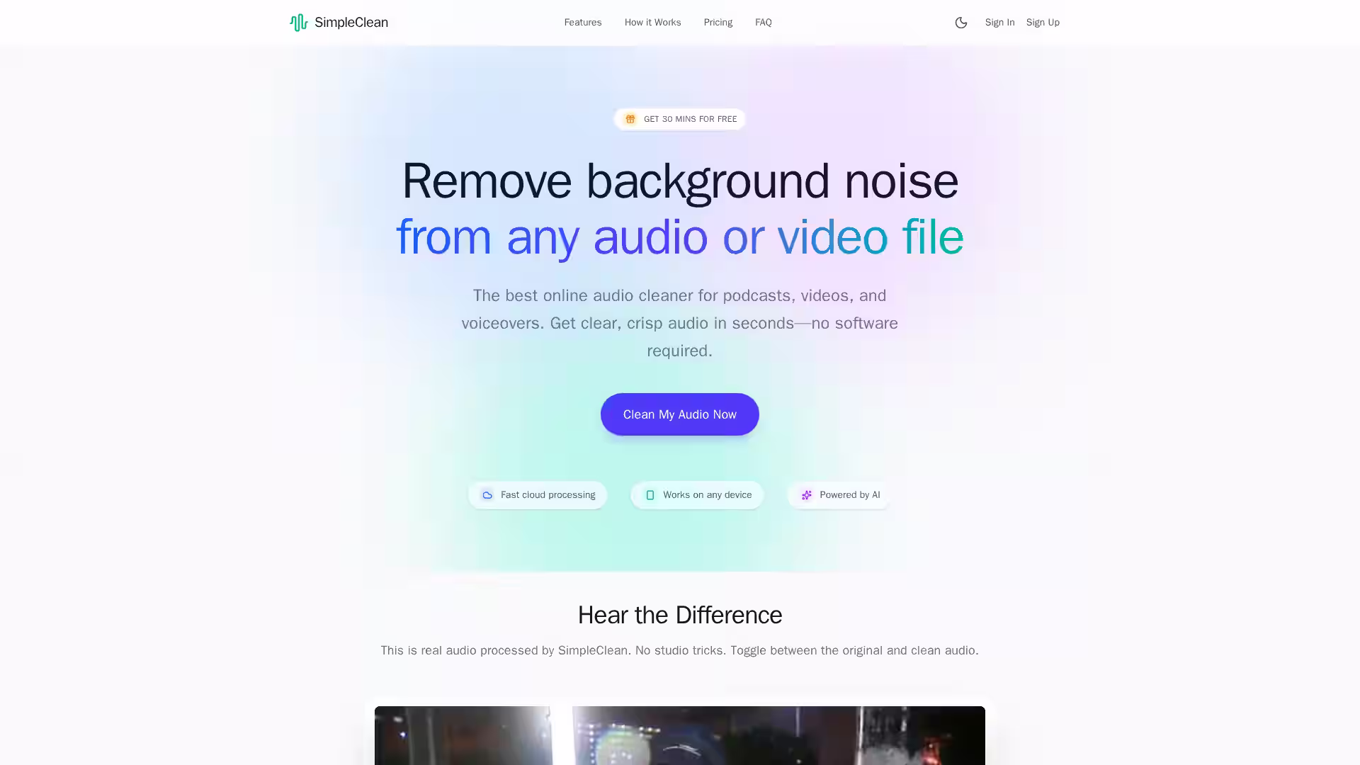 SimpleClean is an AI-powered online tool designed to effortlessly remove background noise from audio and video files. Whether you're a podcaster, YouTuber, marketer, educator, or casual user, SimpleClean provides professional-grade audio clarity in just minutes—all without installing software or dealing with complicated settings. Supporting a wide range of audio and video formats, SimpleClean offers a fast, cloud-based solution that works on any device with a web browser. With transparent pricing and bulk upload features, it’s trusted by thousands of creators worldwide to deliver clean, crisp sound quickly and affordably.