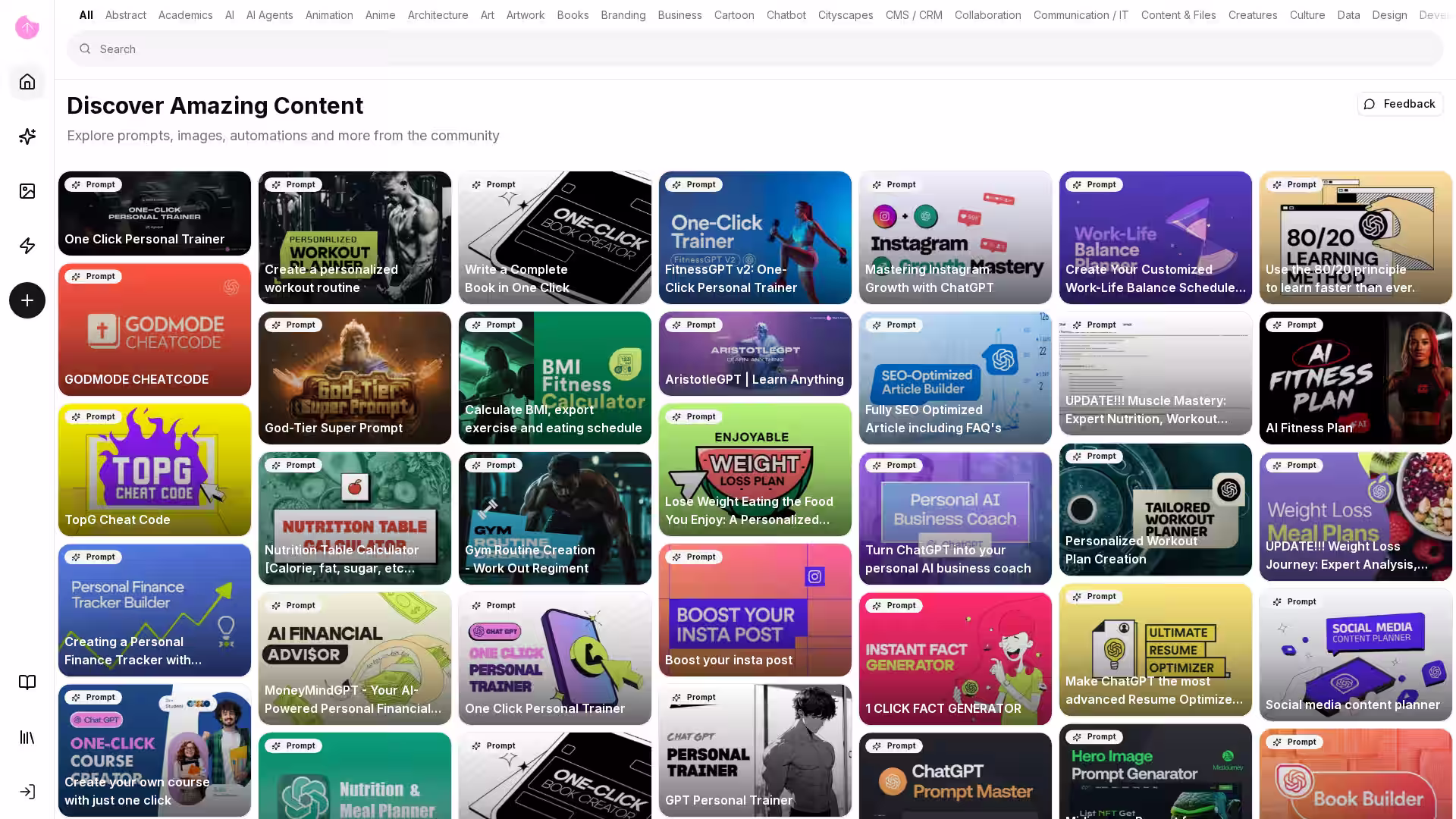 Diverse Content Library: Access thousands of AI prompts, generated images, and automation workflows categorized across numerous topics from academics to surrealism.