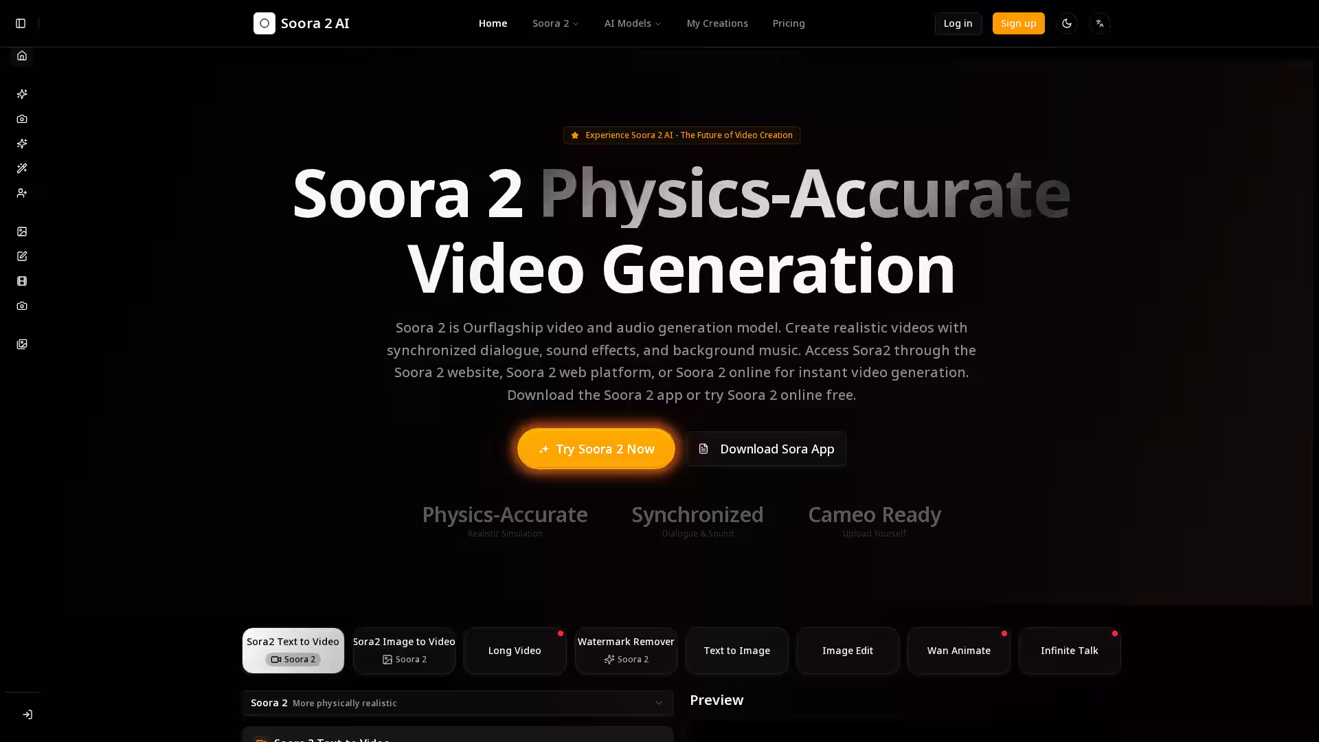Sora 2 AI represents the cutting edge of video creation technology, delivering physics-accurate video and audio generation. Developed as the flagship model of Soora2Video.com, Sora 2 dramatically advances the state-of-the-art with its ability to simulate realistic world dynamics while integrating perfectly synchronized dialogue, sound effects, and background music. With breakthrough controllability and immersive cameo features, users can create stunning videos ranging from adult-oriented cartoons to educational documentaries, all built on a foundation of physics-consistent animation and AI-driven storytelling.