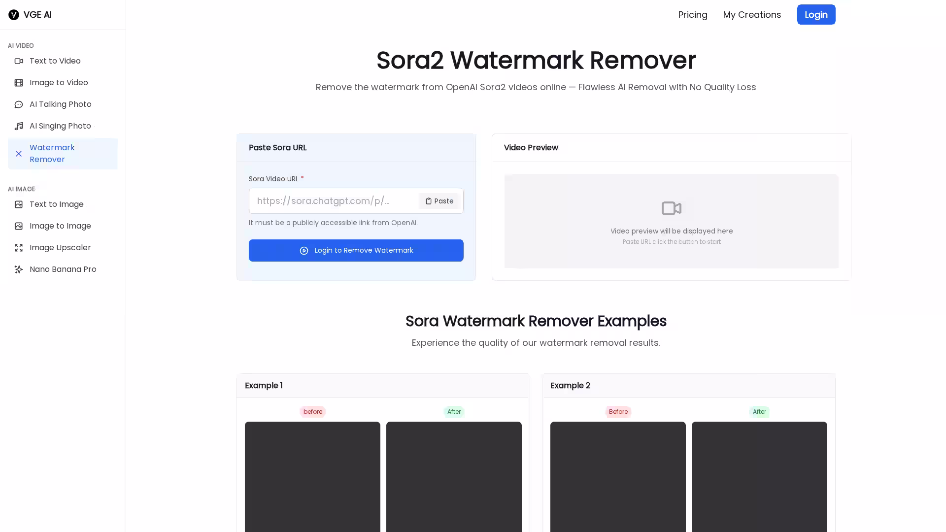 Sora Watermark Remover is a free online tool developed by VGE AI designed to remove watermarks from OpenAI Sora2 videos. It offers fast, secure, and high-quality watermark removal with no quality loss. Users simply paste their Sora video URL to instantly get a clean video, leveraging advanced AI technology for flawless removal.