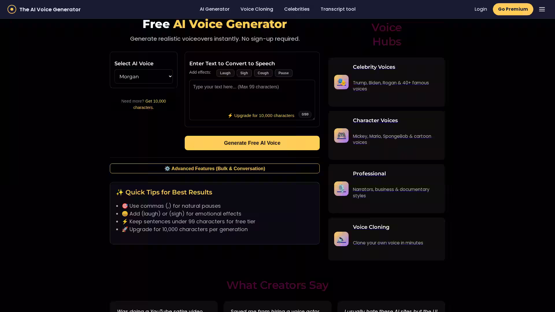 The interface is streamlined for speed: simply select a voice, type in your text (up to 99 characters for the free tier), generate audio, and download. Premium users unlock the ability to generate up to 10,000 characters per clip and gain access to advanced bulk and conversation generation features.