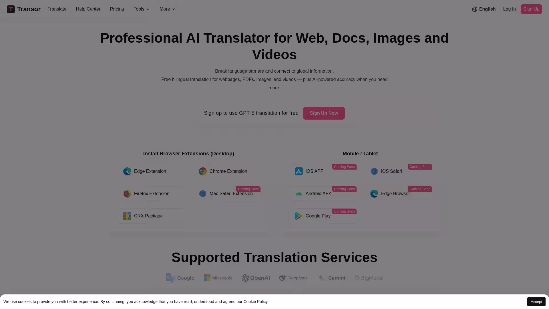 Transor is a professional AI translation tool designed to break language barriers by providing real-time, high-precision translations for webpages, documents, images, and video subtitles. Integrating cutting-edge large language models including GPT-5, OpenAI ChatGPT, DeepSeek, and Google Gemini AI, Transor empowers millions of users worldwide to access global information effortlessly. Whether you’re reading foreign news, translating academic papers, or watching videos with subtitles, Transor offers seamless bilingual translation right where you need it.