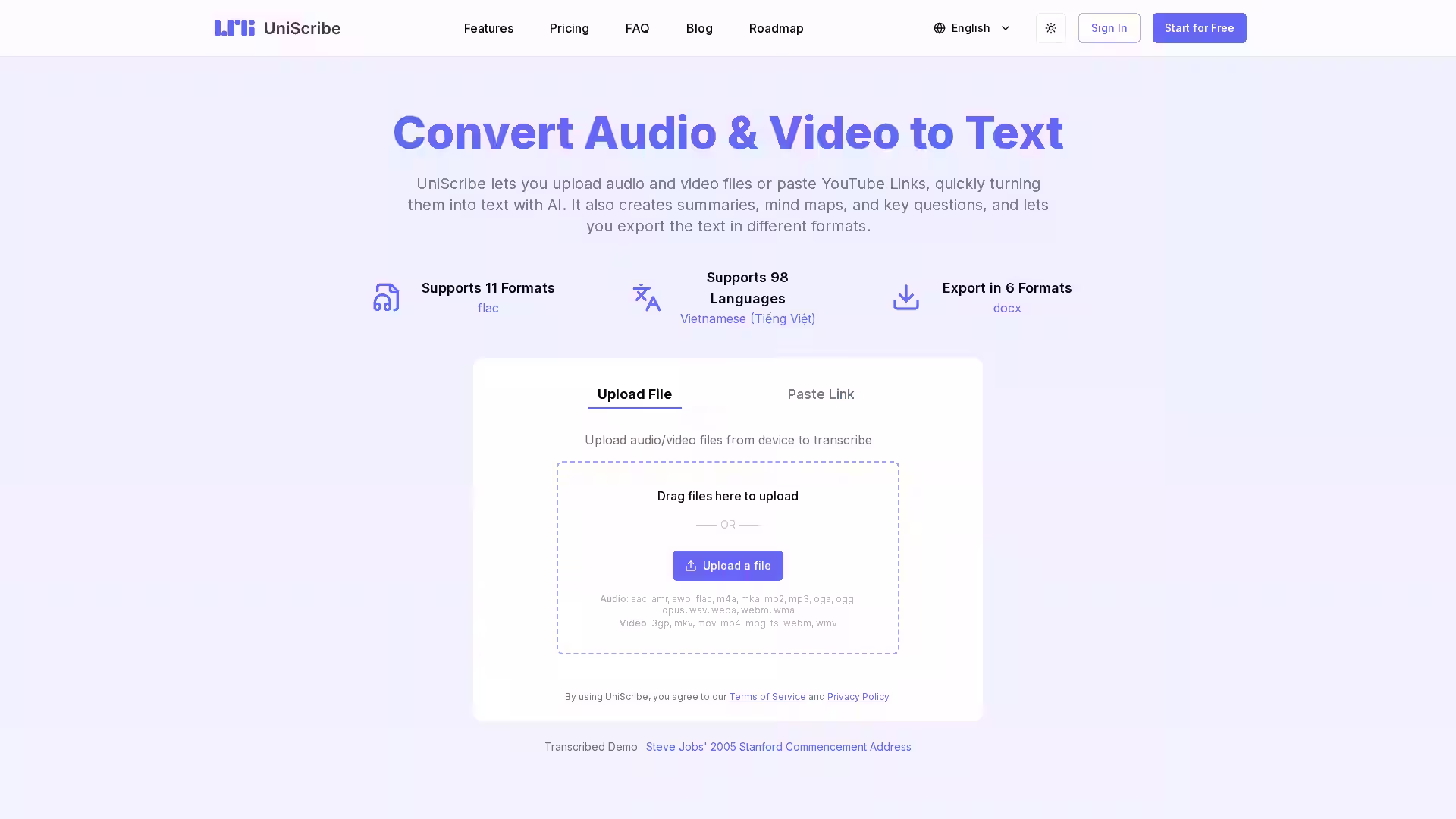 Q: Which formats are supported? UniScribe supports a wide range of audio/video formats including mp3, mp4, wav, wma, mkv, and more.