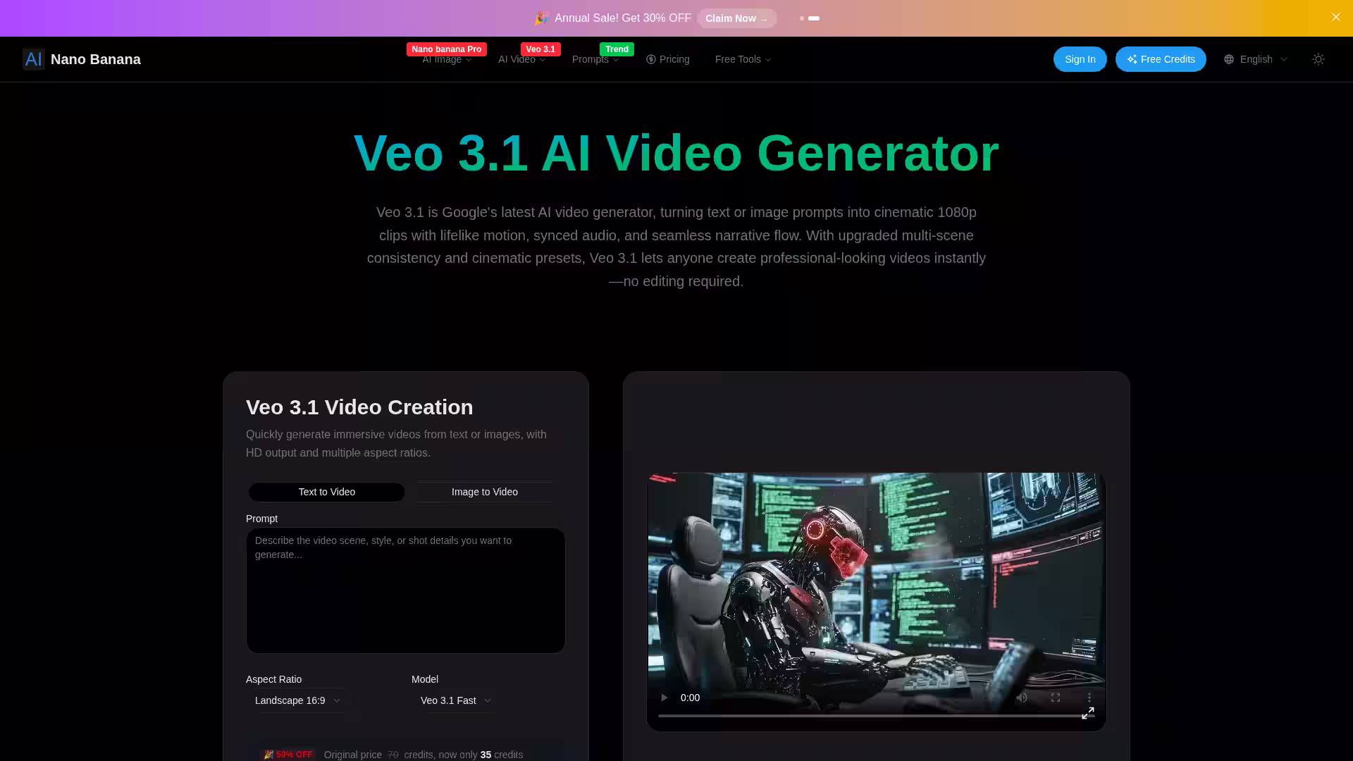 Veo 3.1 AI Video Generator is Google DeepMind’s latest innovation in AI-powered video creation technology, brought to you by Nano Banana. It transforms simple text or image prompts into high-fidelity, cinematic 1080p videos complete with synchronized audio, lifelike motion, and smooth narrative flow. Designed for users of all skill levels, Veo 3.1 generates professional-quality short clips instantly, without the need for complex editing. With advanced scene consistency, cinematic presets, and extended creative controls, it lets you bring your storytelling vision to life in seconds.