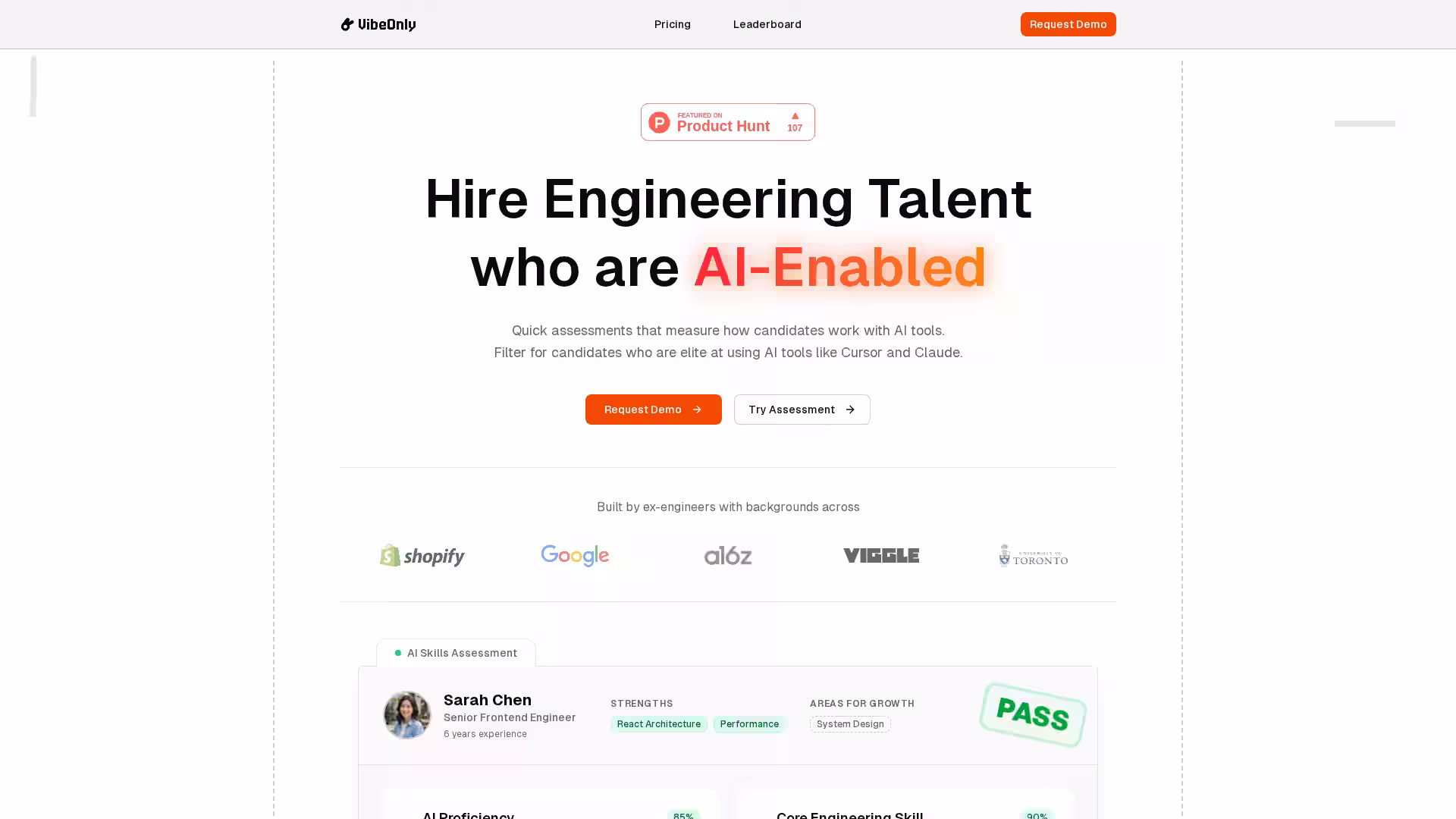 Fast-growing startups don’t have the time or resources to manually screen hundreds of candidates. VibeOnly’s automated, AI-driven assessments help these companies staff engineering teams with individuals who can immediately contribute using AI tools.