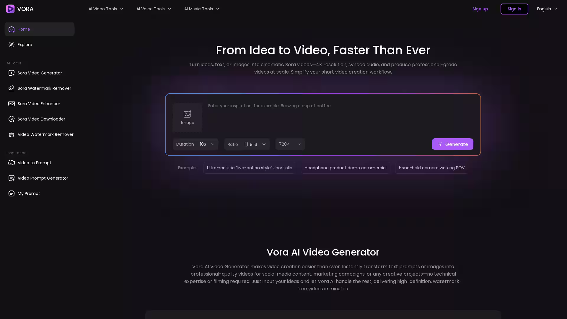 Vora is an AI video generator that enhances Sora videos, helping users generate better Sora videos while saving time and money. Vora supports the creation of high-definition, watermark-free Sora videos with sound, from text or images, with unlimited generations, with no generation limits. It has built-in practical creation tools, supporting instant removal of the Sora watermark and clear, lossless video enhancement. Simply upload any video material to reverse-engineer the prompt for quick creati
