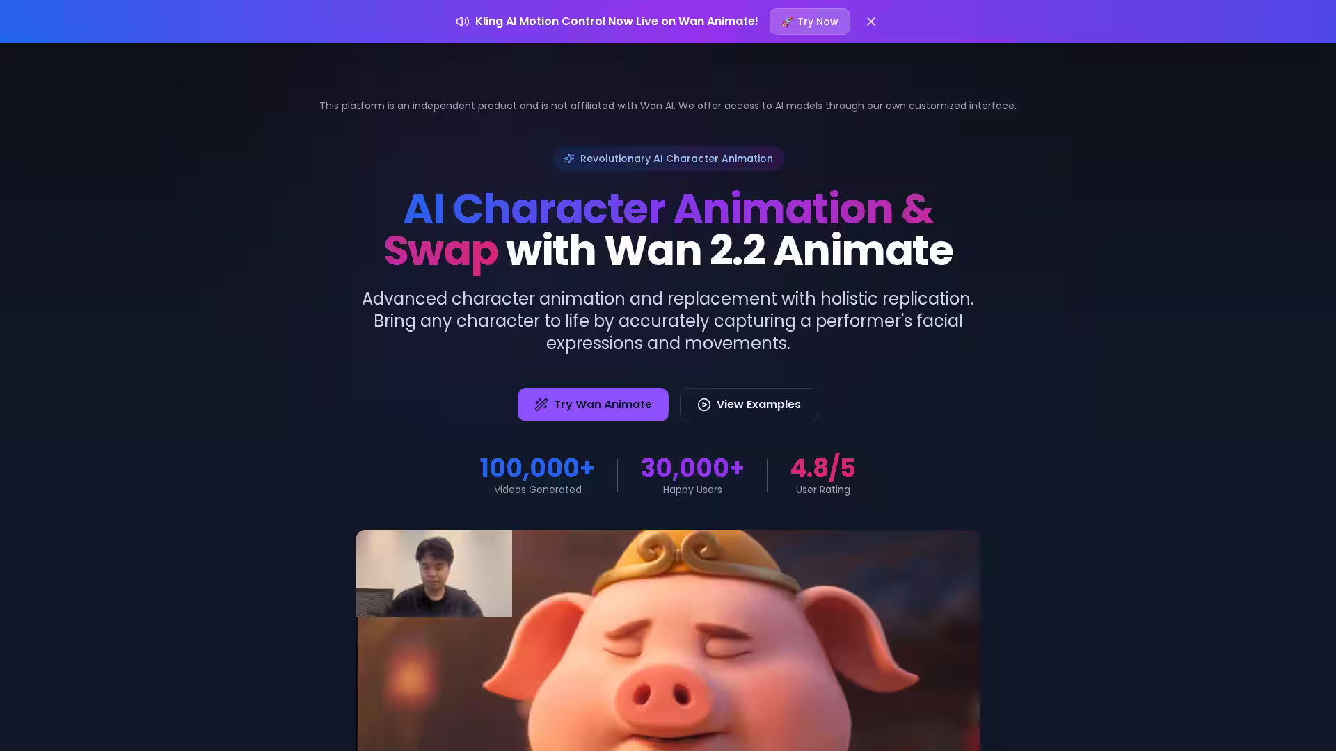 With over 100,000 videos generated and 30,000+ happy users boasting a 4.8/5 user rating, Wan Animate offers a powerful, easy-to-use interface where users upload a character image and a performer video to create realistic animated videos quickly and efficiently.