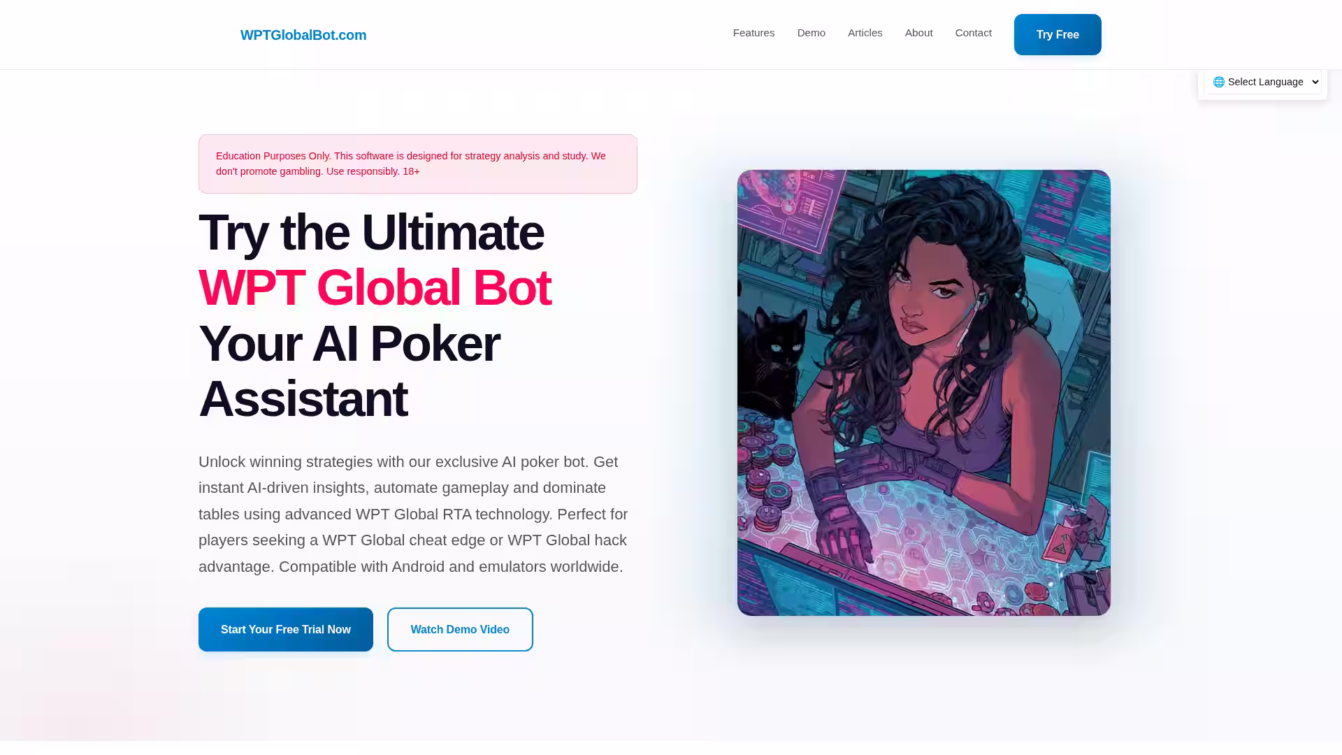 The WPT Global Bot is an advanced AI-powered poker assistant designed to help players master WPT Global poker environments. It leverages sophisticated neural networks and proprietary real-time assistance (RTA) technology to offer both fully automated gameplay and live strategic guidance. Compatible with Android devices and emulators worldwide, this tool focuses on improving your poker skills through data-driven insights, automated playing, and intelligent table selection. Whether you're a casual player seeking to sharpen your game or a grinder aiming to maximize efficiency, the WPT Global Bot provides an all-in-one solution tailored to Texas Hold'em (NLH) and Pot Limit Omaha (PLO) cash games, with Multi-Table Tournament (MTT) support coming soon.