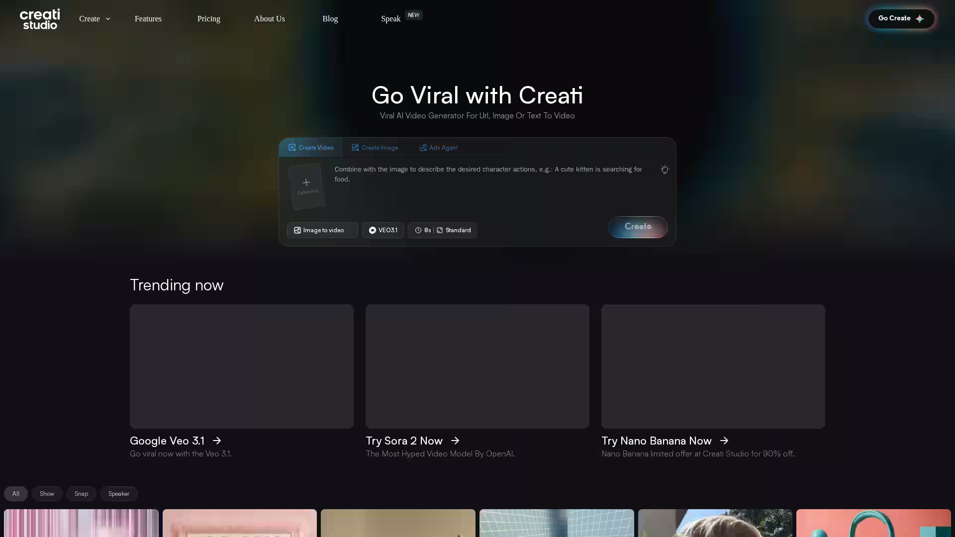 Creati AI Viral Video Generator is a cutting-edge tool designed to simplify and revolutionize video ad creation for content creators, marketers, and e-commerce businesses. Leveraging advanced AI technology, Creati AI allows users to transform product URLs, images, or text into engaging, realistic, and professional-quality video advertisements in just minutes — no expensive shoots or complex editing required. Trusted by millions worldwide, this platform empowers users to generate viral videos that capture attention, boost engagement, and drive conversions.